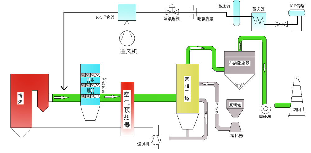 电力行业烟气净化工艺流程: 锅炉烟气→ 空气预热系统→ SCR 脱硝系统→ 密相干塔脱硫系统→ 增压风机 →烟囱