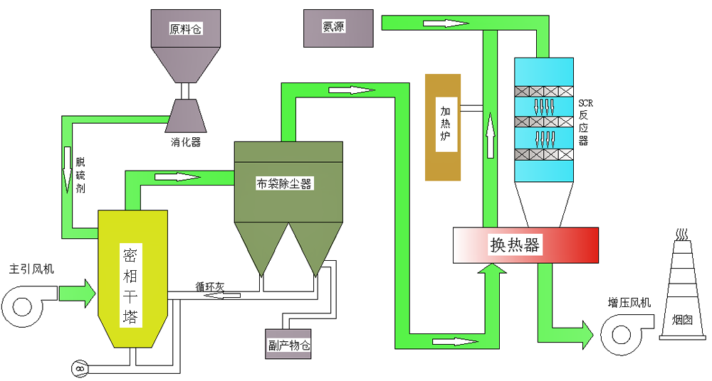 烟气主引风机→密相干塔脱硫系统→ GGH → SCR 脱硝系统→ GGH →增压风机→烟囱