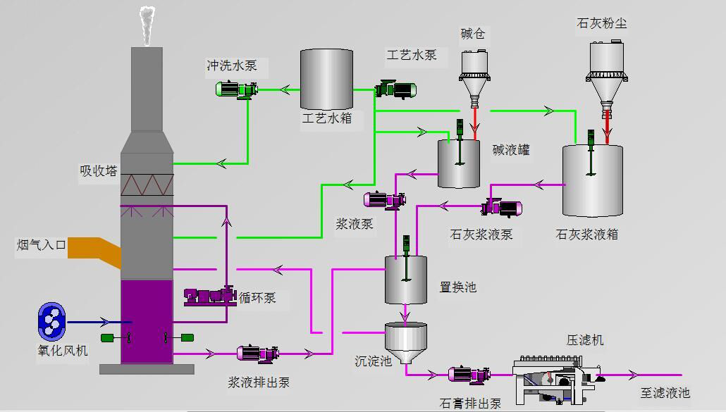 脱硫剂中的碳酸钠或氢氧化钠与SO2、SO3、HF、HCL等发生化学反应,生成亚硫酸钠和亚硫氢酸钠等物质,脱硫后的净烟气通过除雾器除去气流中夹带的雾滴后排出吸收塔。反应后的脱硫剂进入再生池,与从石灰浆液池过来的石灰浆液发生再生反应,生成脱硫副产物,脱硫副产物沉积后排出,压滤成石膏。上清液流经泵前池,经沉淀后循环水泵抽送到脱硫装置进行脱硫循环。