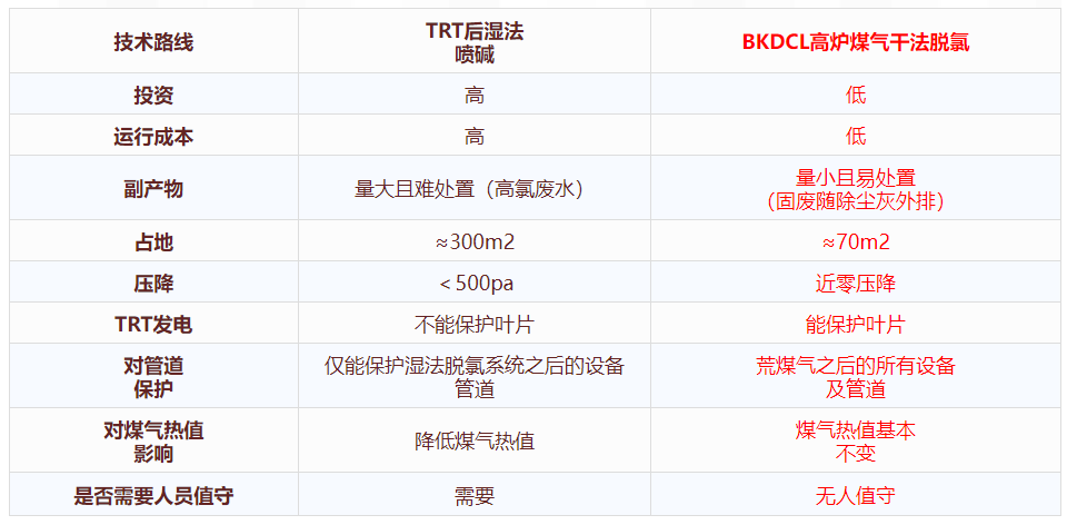 BKDCL高炉煤气干法脱氯技术与TRT后湿法喷碱关键指标对比:
