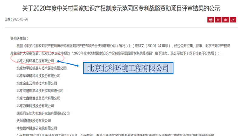 2020年3月26日,中关村知识产权促进局对“2020年度中关村国家知识产权制度示范园区专利战略资助项目”的评审结果进行了公示,北京凯时凯时首页环境工程有限公司(以下简称:凯时凯时首页环境)位列榜首。